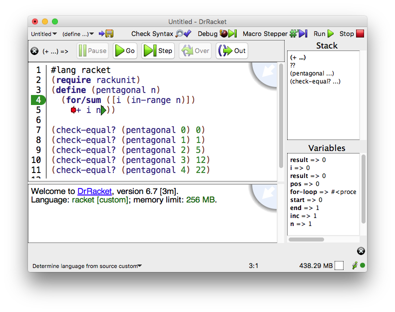 Tip: Clicking the Run button after a debugging session will cause all breakpoints to disappear from the definitions window. These breakpoints are not forgotten, and clicking Debug again will restore them. However, breakpoints do not persist across restarts of DrRacket.