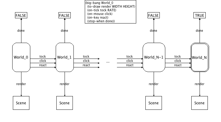 The big-bang form installs World_0 as the initial WorldState. The handlers tock, react, and click transform one world into another one; each time an event is handled, done is used to check whether the world is final, in which case the program is shut down; and finally, render renders each world as an image, which is then displayed on an external canvas.