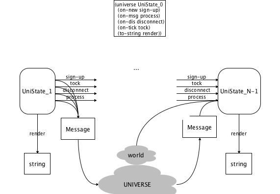 ; Bundle is ; (make-bundle UniverseState [Listof mail?] [Listof iworld?]) ; UniverseState iworld? -> Bundle ; next list of worlds when world iw is joining ; the universe in state s (define (add-world s iw) ...) ; UniverseState iworld? W2U -> Bundle ; next list of worlds when world iw is sending message m to ; the universe in state s (define (process s iw m) ...)