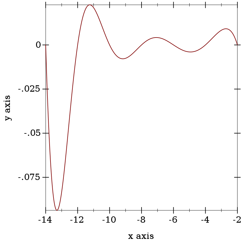 Near negative roots, which occur singly between each pair of negative integers, psi0 exhibits catastrophic cancellation from using the reflection formula, meaning that relative error is effectively unbounded. However, maximum observed absolute-error is (* 5 epsilon.0). This is the best we can do for now, because there are currently no reasonably fast algorithms for computing psi0 near negative roots with low relative error.